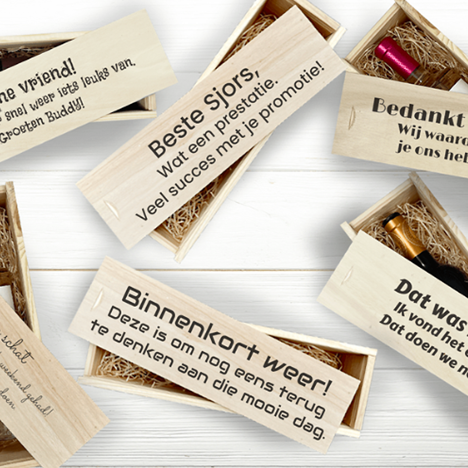 Bij Gifts and Drinks kies je een lekkere fles, bijvoorbeeld wijn of Champagne. Daarna laat je jouw persoonlijke boodschap voor familie, vriend of zakelijke relatie bij ons achter. En wij doen de rest!